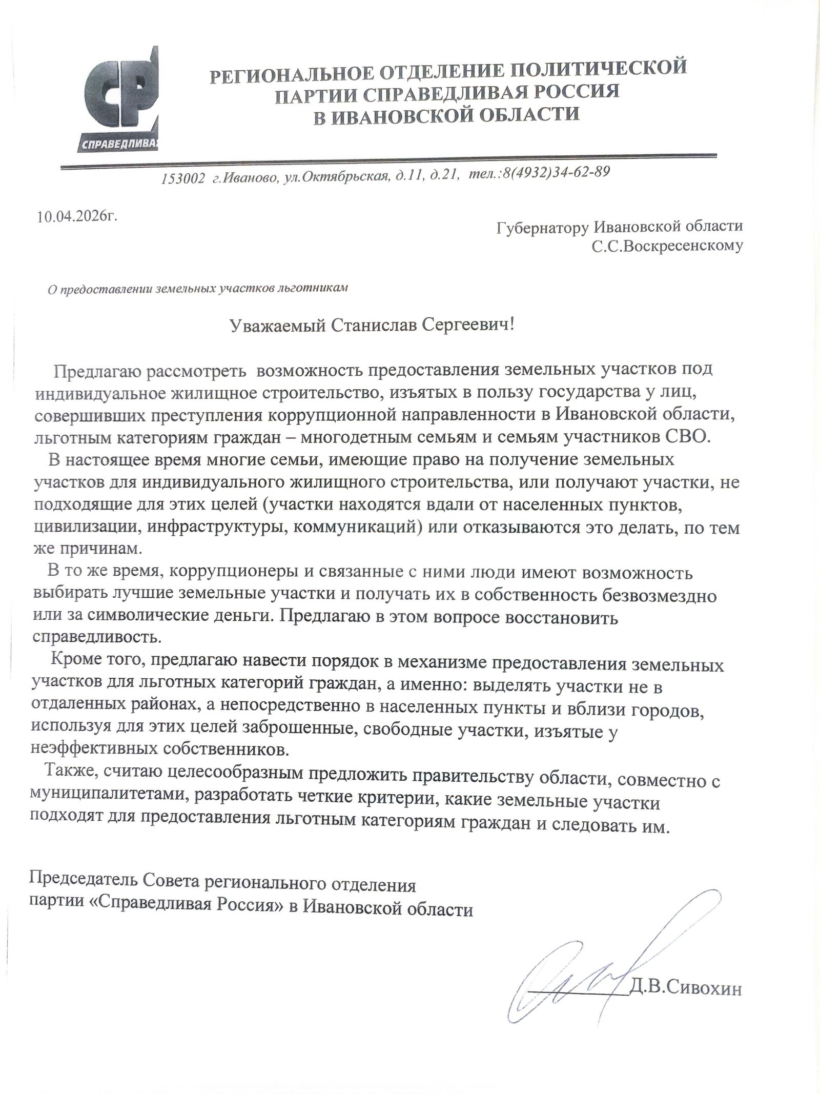Руководитель регионального отделения Партии СПРАВЕДЛИВАЯ РОССИЯ в Ивановской области Дмитрий Сивохин обратился к Губернатору С.С. Воскресенскому с предложением о предоставлении земельных участков под ИЖС, изъятых у коррупционеров, льготным категориям граждан – многодетным семьям и участникам СВО. Кроме того, он призвал власти навести порядок с выделением таких участков – предоставлять их льготникам вблизи городов.