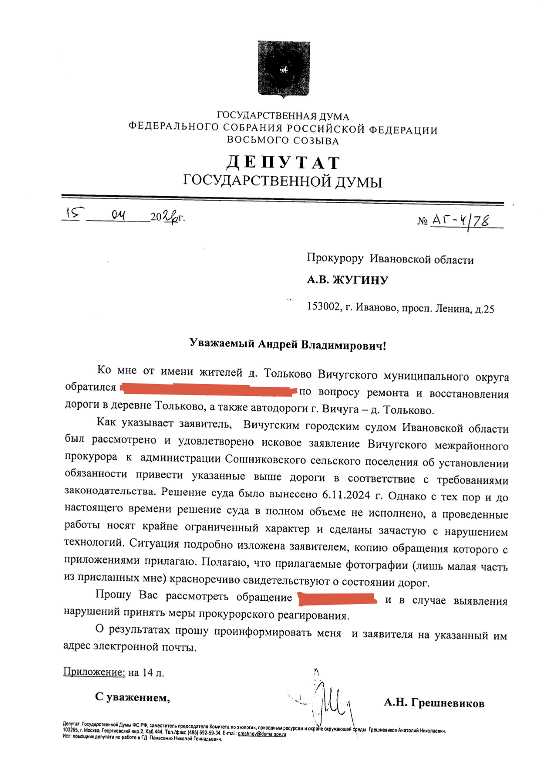 Мы адресовали обращение депутату Государственной Думы от СПРАВЕДЛИВОЙ РОССИИ Анатолию Грешневикову. Анатолий Николаевич обратился к прокурору Ивановской области Андрею Жугину с призывом вмешаться в ситуацию.